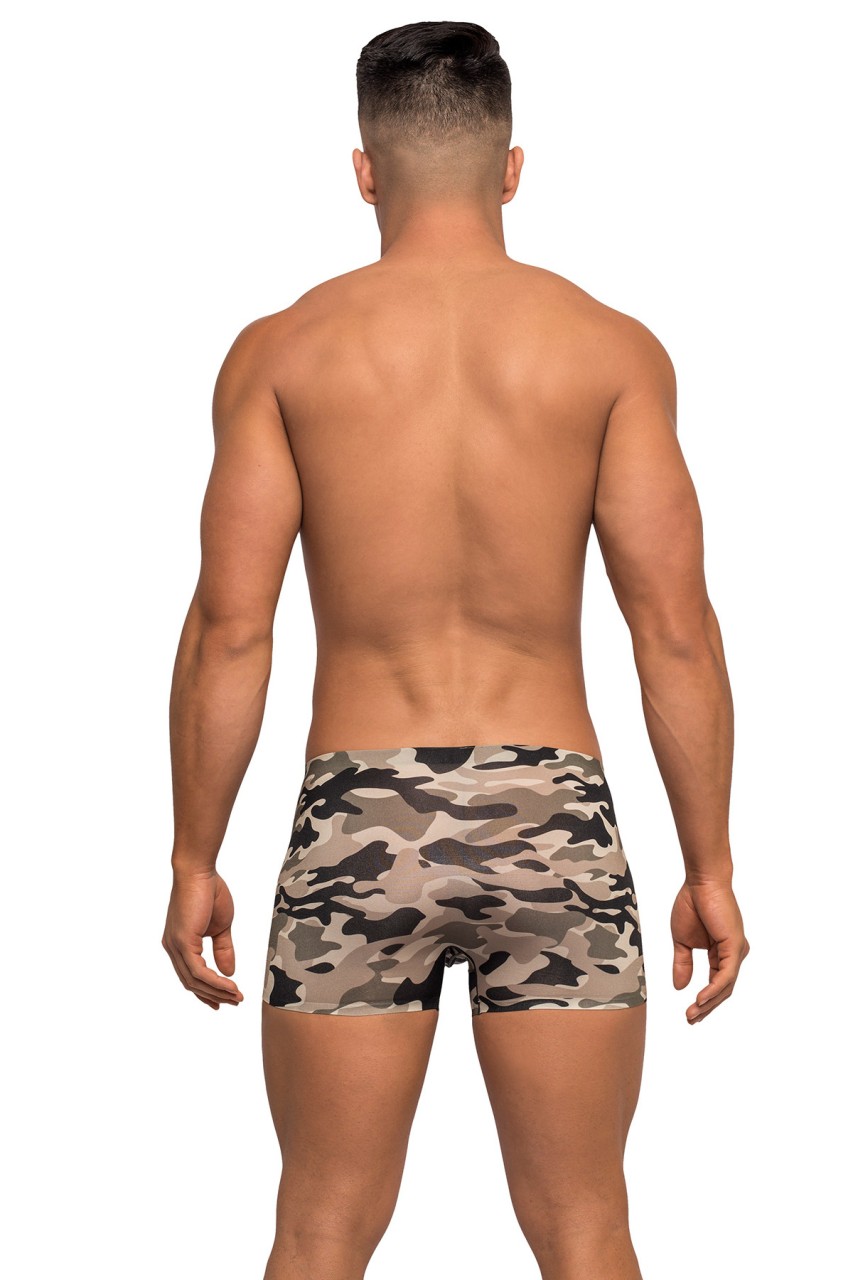 Mini short, low rise waist, mid thigh cut legs. Decoratively stitched contoured pouch. Seamless, bonded hem and waist.88% Nylon 12% Spandex