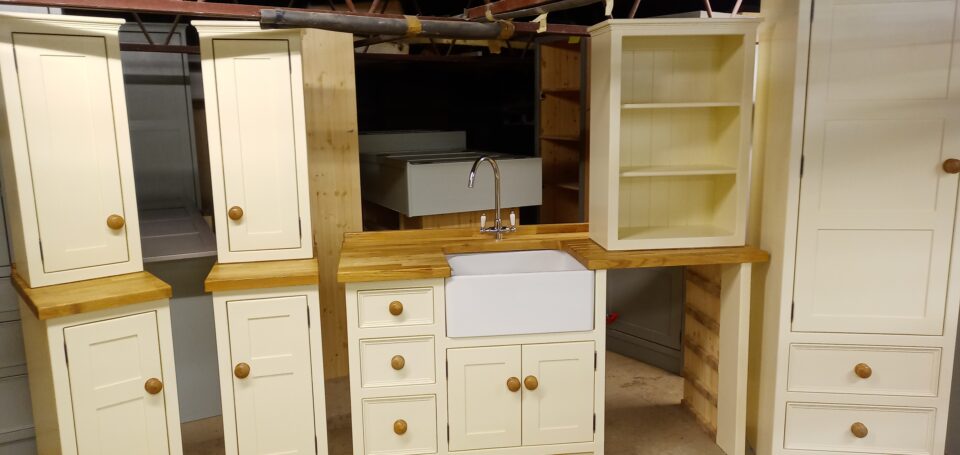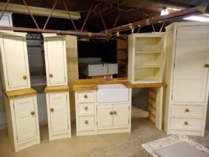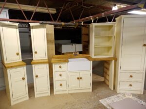 Hand painted in farrow and ball colour of your choice.Knobs-waxed, ebonised or painted. 25mm Pine Worktops