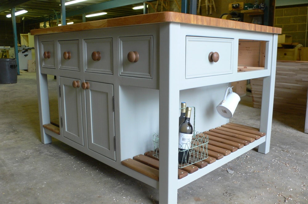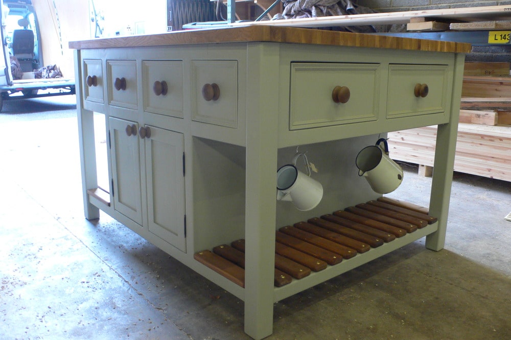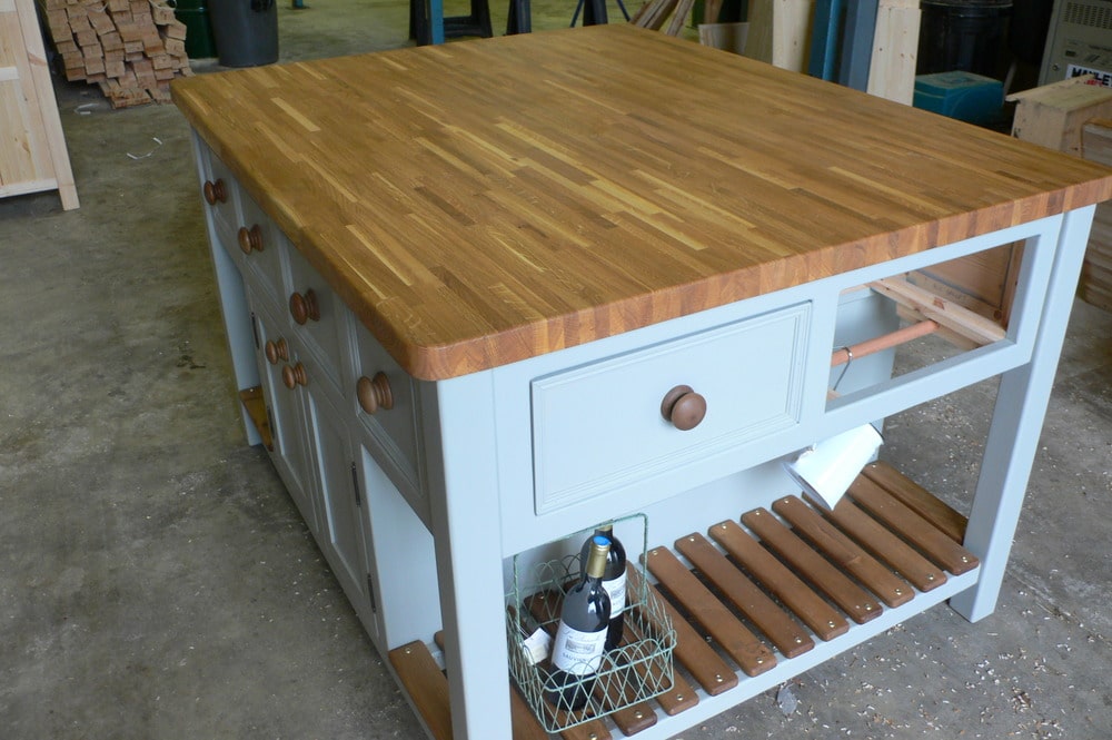 Island units not only make great features in your kitchen but give you loads more storage and worktop space, this unit has lovely deep cupboards running through the middle with plenty of drawers, the ends have been left open with a slatted base-perfect for baskets, and as you can see this island has dowel rods above the slats on which to hang jugs, pans, utensils etc. This Parma Grey Island Unit has been painted in farrow and balls 'Parma Grey' with a 25mm pine worktop (this has been stained then coated with layers of waterproof wax so making it durable) and matching knobs on doors and drawers.