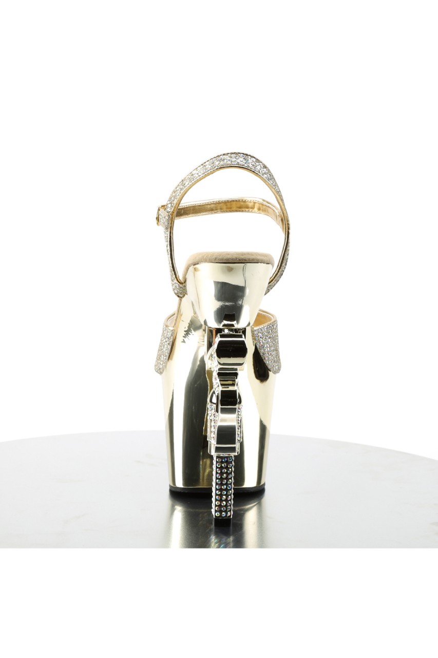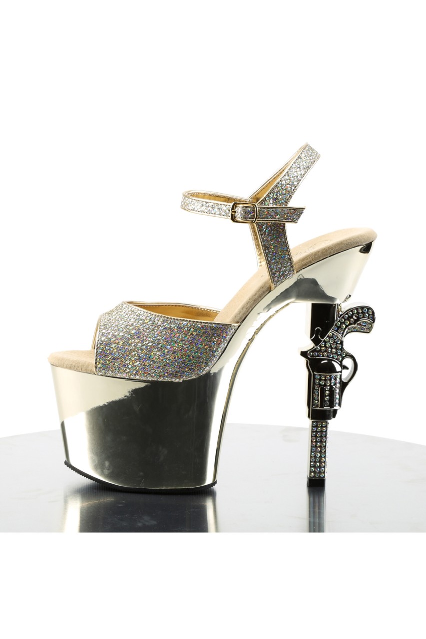 7″” (17.8cm) Rhinestone Embellished Gun Heel, 3 1/4″” (8.3cm) Platform Ankle Strap Sandal