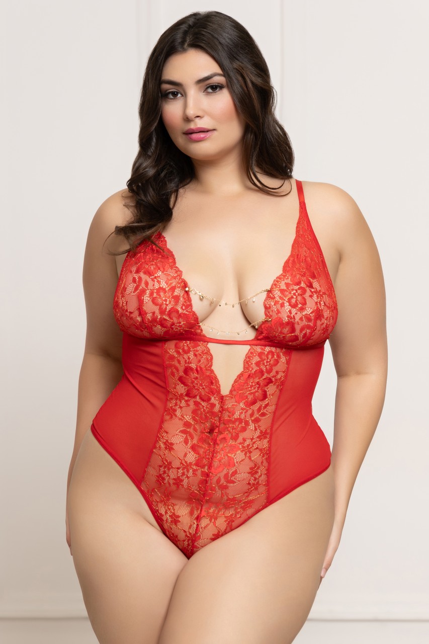 Lurex lace and mesh teddy with removable rhinestone chain detail, adjustable straps, gold hardware, and open crotch