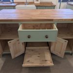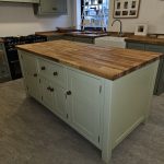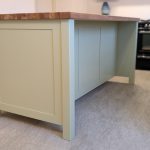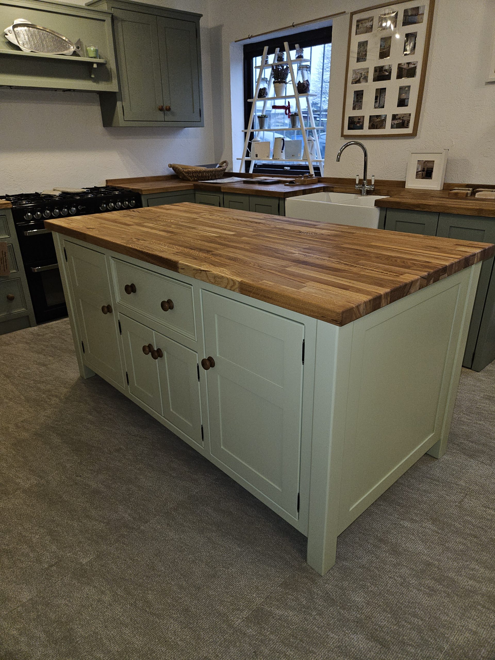 This item is in stock and currently displayed in our showroom. It is painted in farrow and ball colour matched “Cooking Apple Green” and fitted with an oiled 40mm oak worktop.