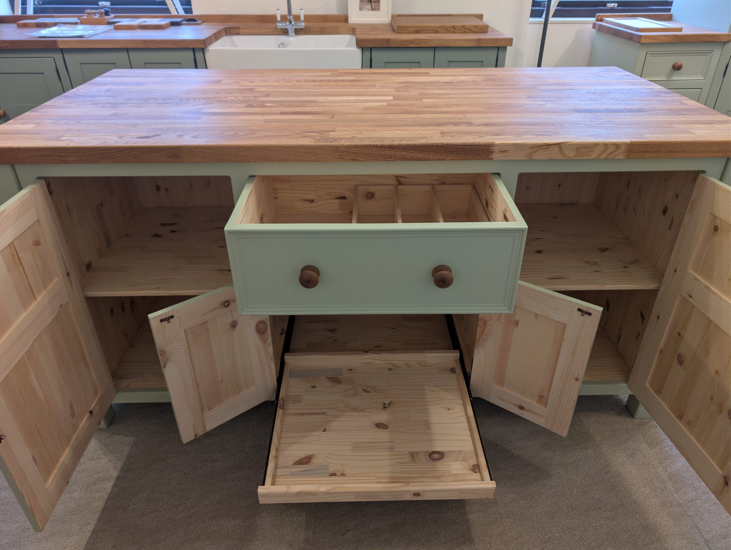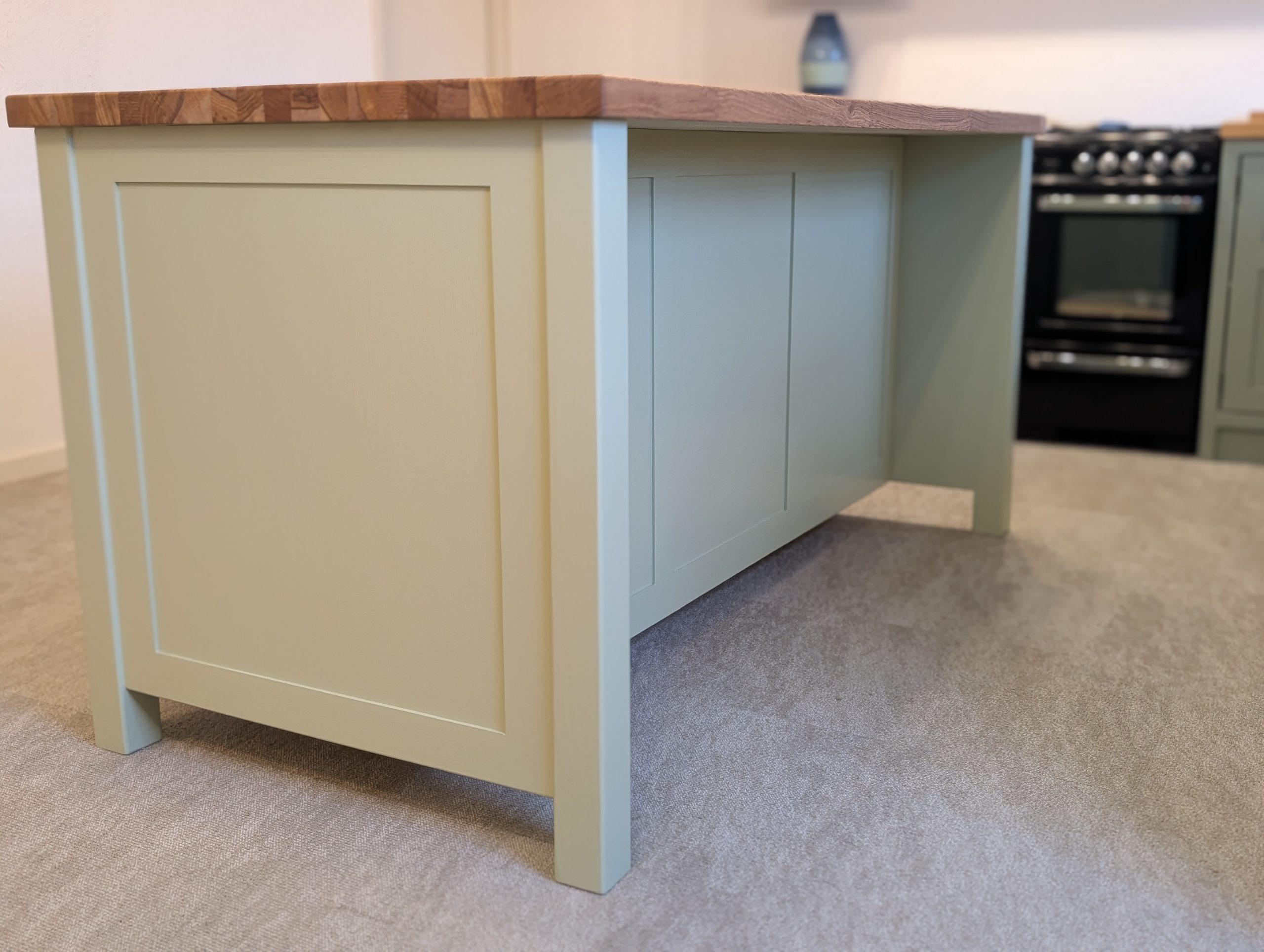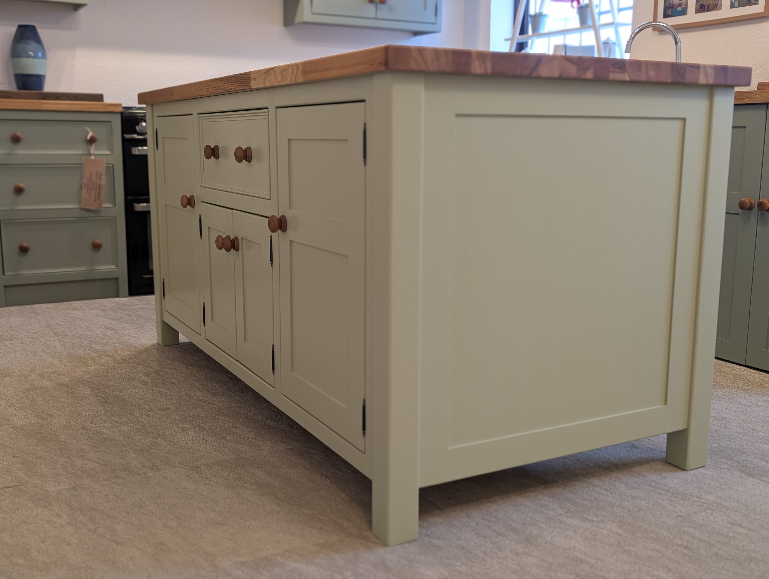 This island has been made from 100% solid softwood pine. This island has already had the 40mm oak upgrade fitted (pictured) and is hand-painted in farrow and ball colour matched "cooking apple green".