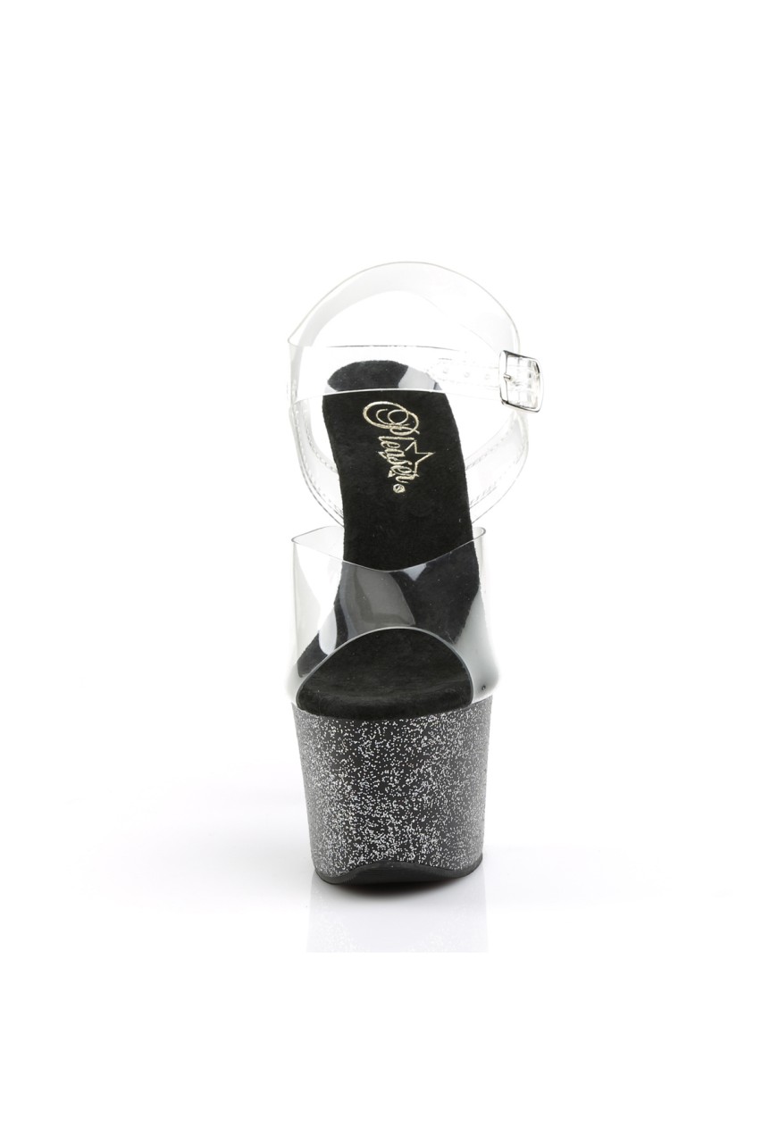 7″” (17.8cm) Heel, 2 3/4″” (7cm) Platform Ankle Strap Sandal Featuring Mini Iridescent Glitter on the Entire Platform