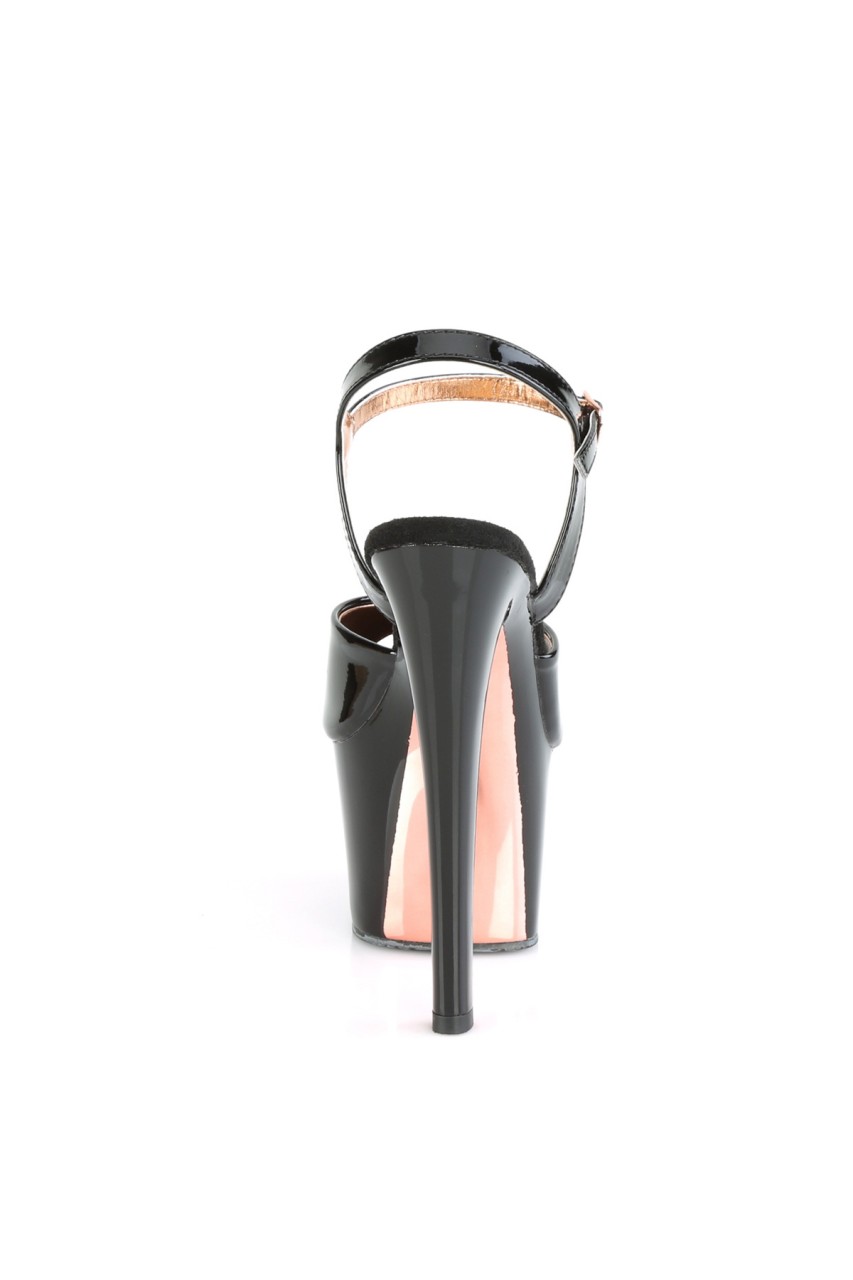 7″” (178mm) Heel, 2 3/4″” (70mm) Platform Two Tone Ankle Strap Sandal Faeturing Chrome Plated Platform Underside & Front of Heel
