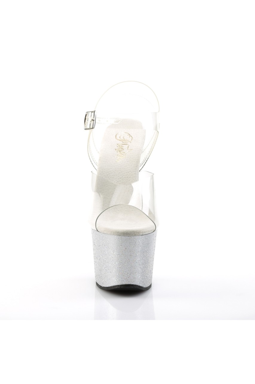 7″” (17.8cm) Heel, 2 3/4″” (7cm) Platform Ankle Strap Sandal Featuring Mini Iridescent Glitter on the Entire Platform