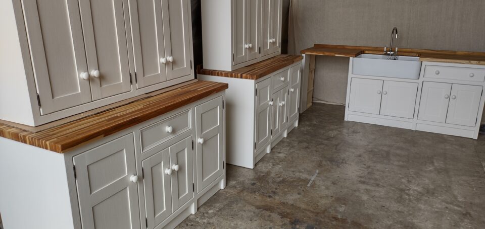 Handmade / Handpainted freestanding and fitted kitchens made in our wetherby workshop from solid pine. Painted in farrow and ball βPointingβ with painted knobs. Comes with 25mm Pine Worktops (picture shows 40mm Teak)