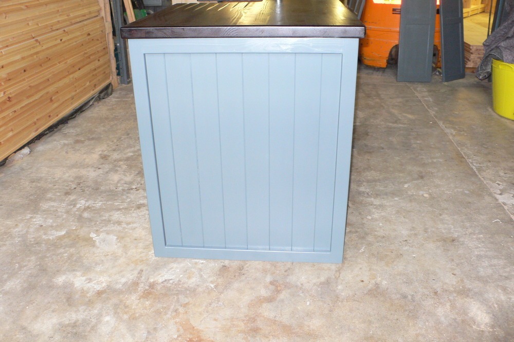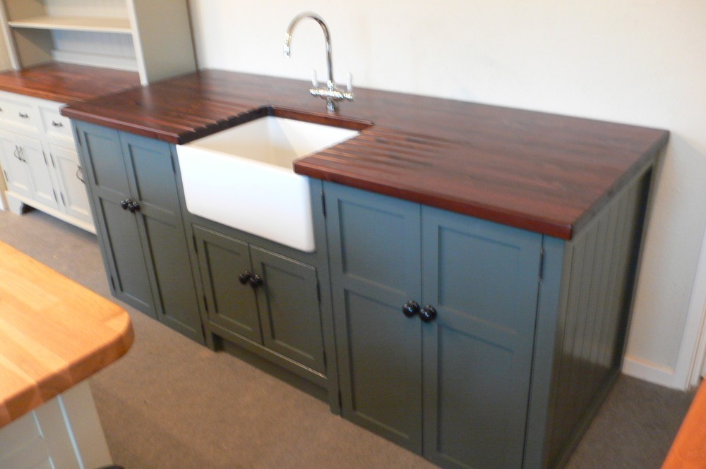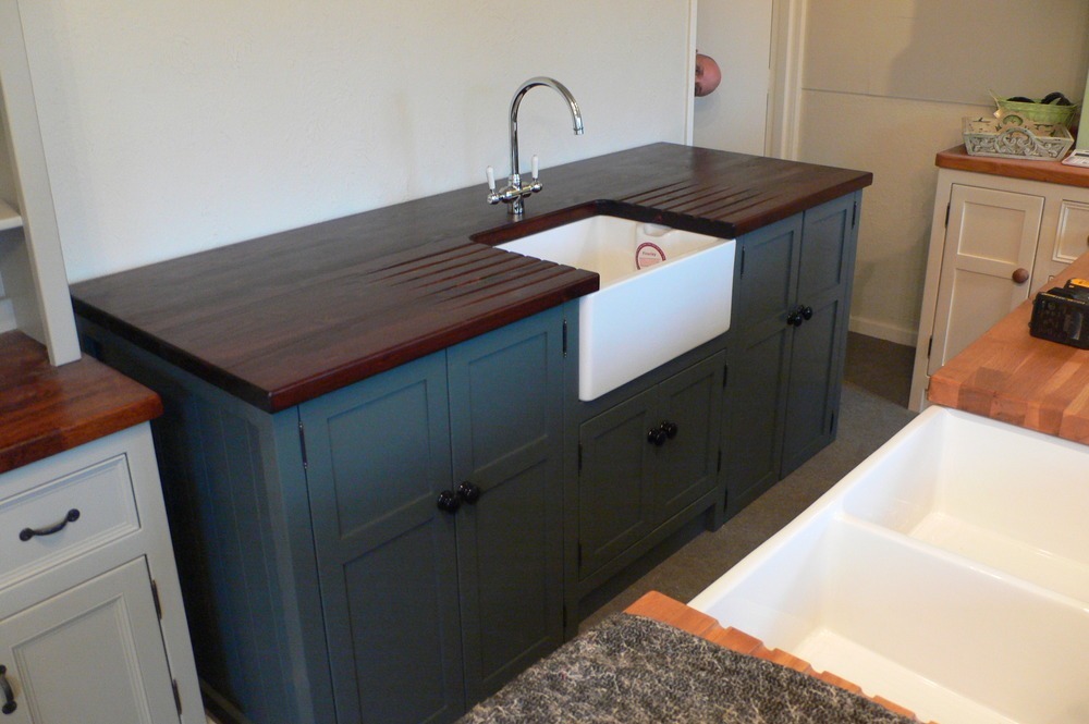 This useful kitchen island would make a super smart addition to your freestanding kitchen. It has a belfast sink with mixer taps, an all important 'Under the Sink' cupboard, either side of this are large cupboards wide and deep enough to hold freestanding appliances such as dishwashers, freezers etc. This unit has been handpainted in Farrow and Balls 'Downpipe', with ebonised knobs and a stained and waterproofed 25mm Pine worktop and drainer. Unlike our usual belfast sink unit the back has been finished and painted too, making a great priced kitchen island unit.