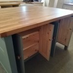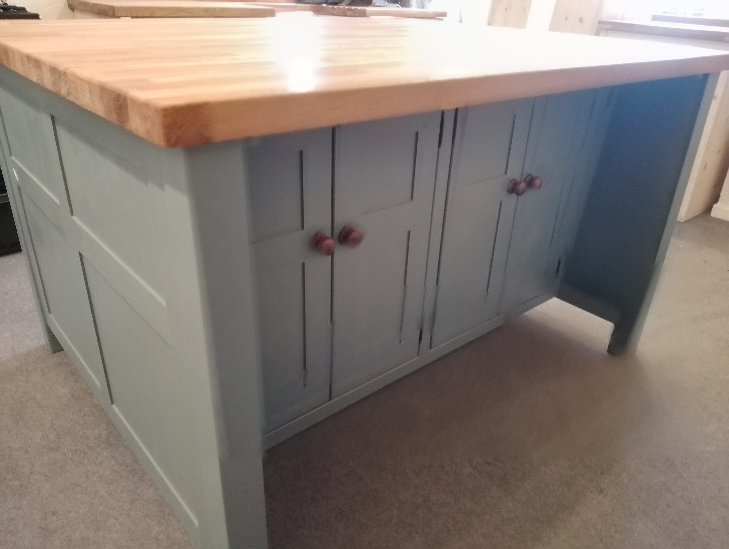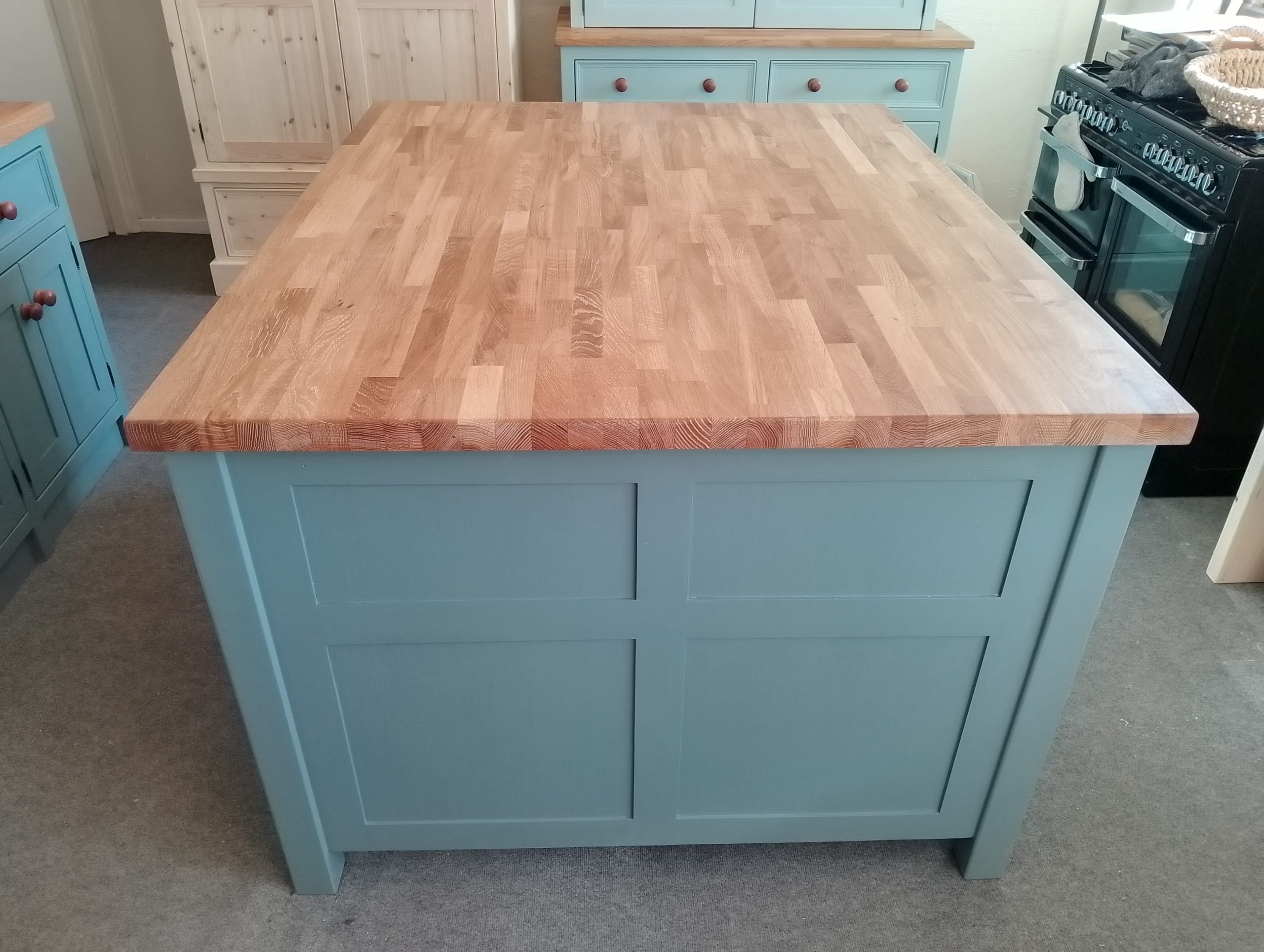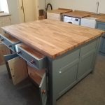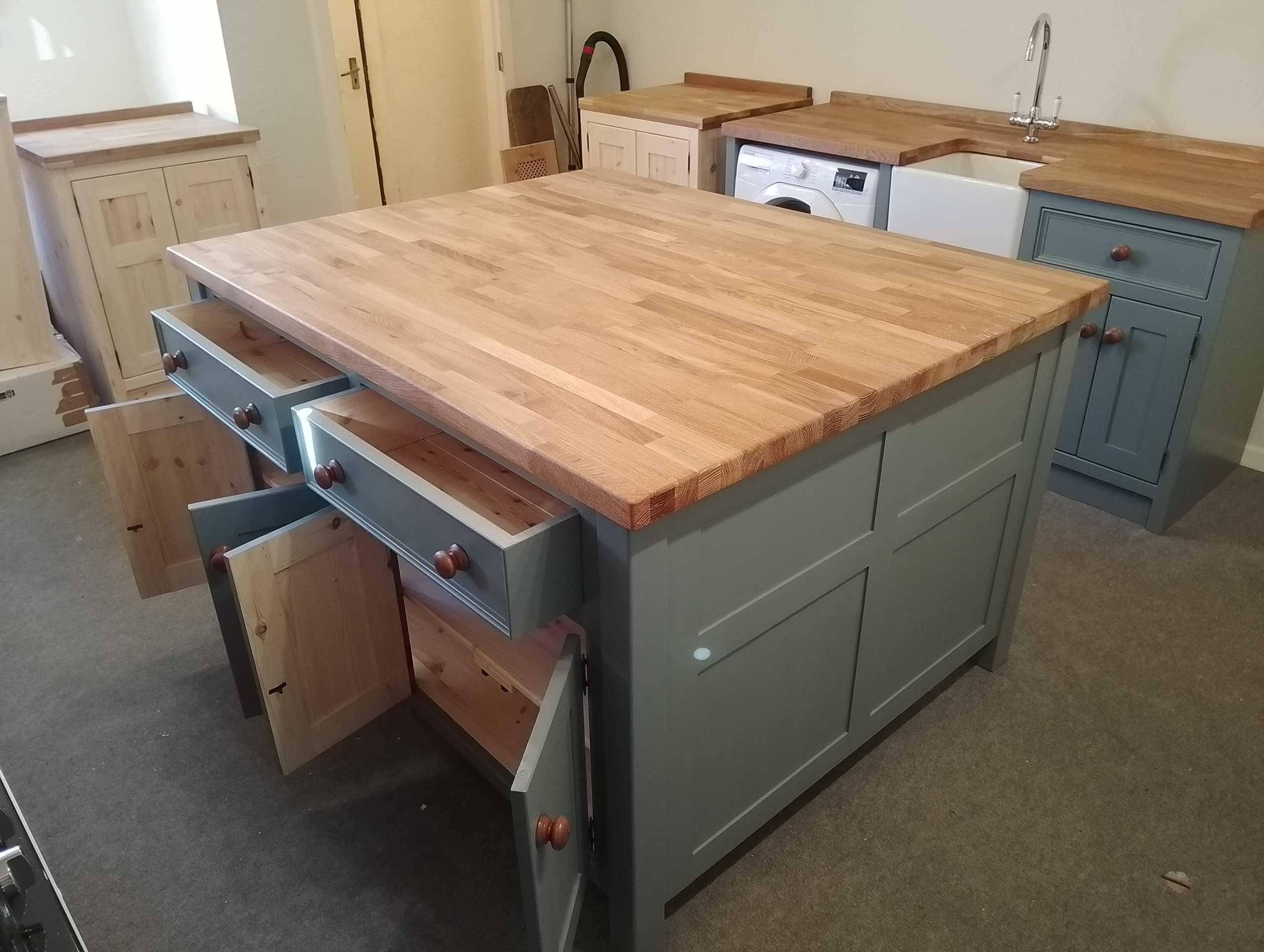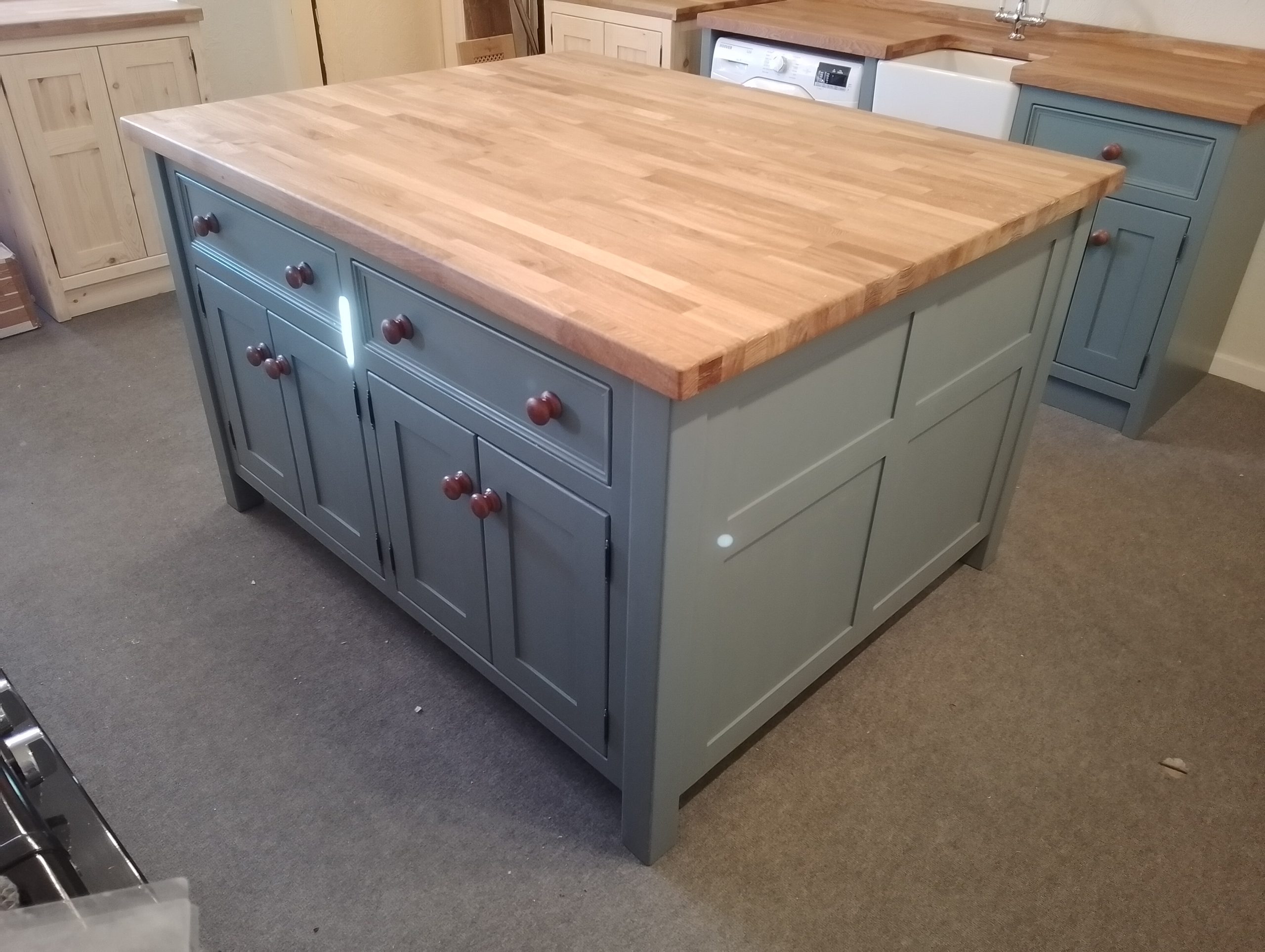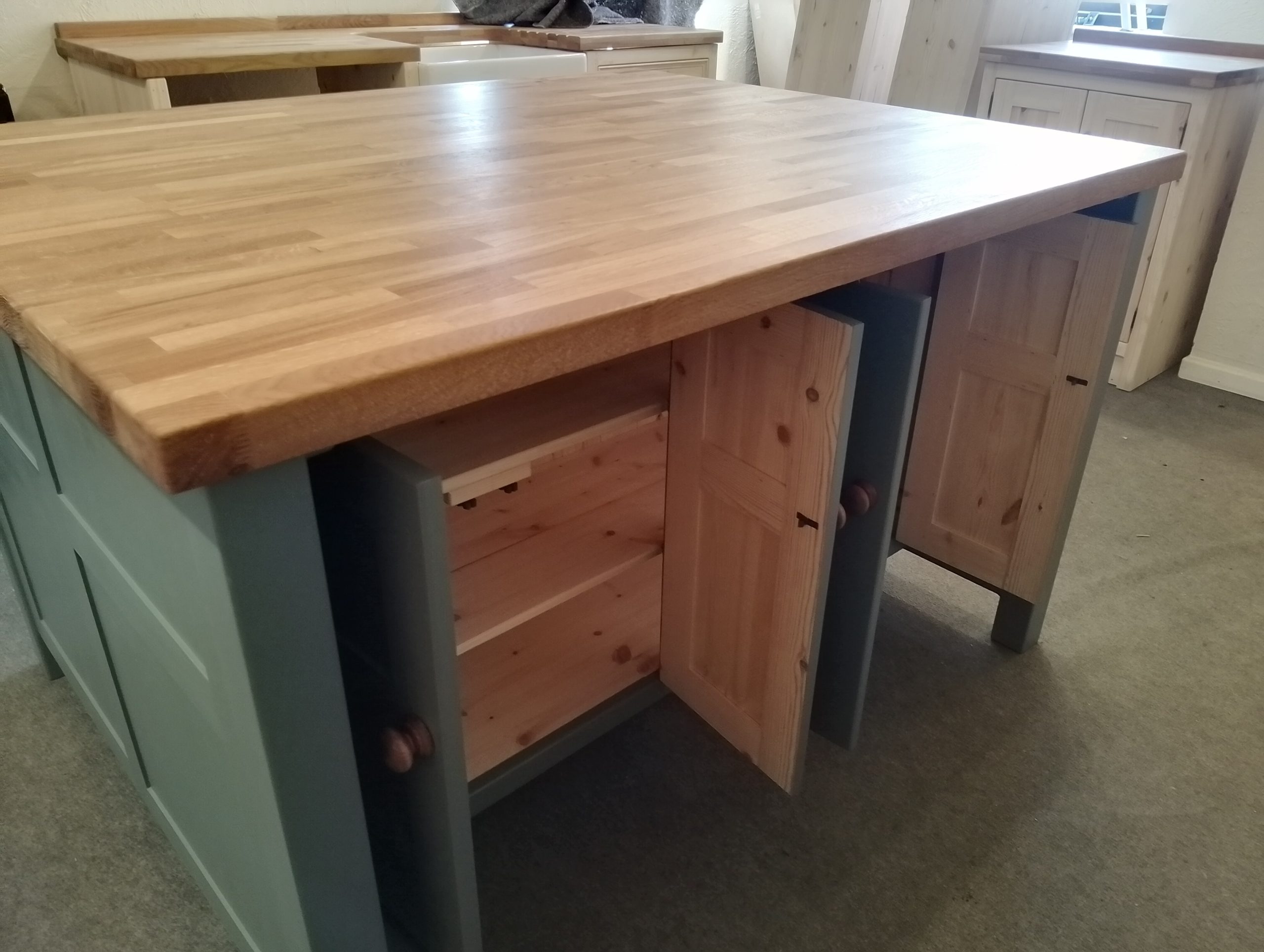 Island unit with double drawers and cupboards with a thin cupboard at the rear- includes an overhang under the worktop where you can put your stools. Comes with an oiled 25mm pine worktop (Note that the 40mm thick oak worktop upgrade is pictured).  A deep island with tonnes of useful storage space.