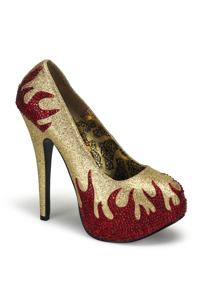 5 3/4″” (14.6cm) Heel, 1 3/4″” (4.5cm) Concealed Platform, Mini Glitter with Red Rhinestone Flames Pump