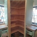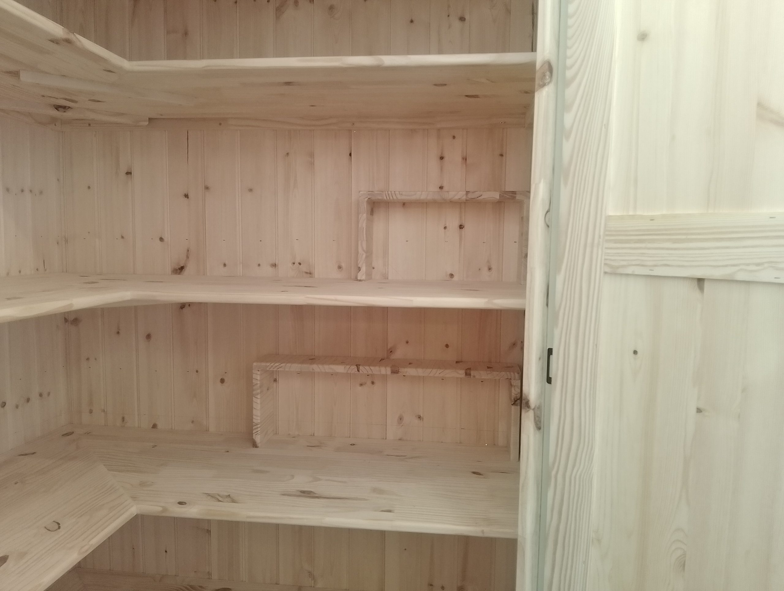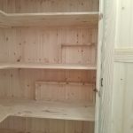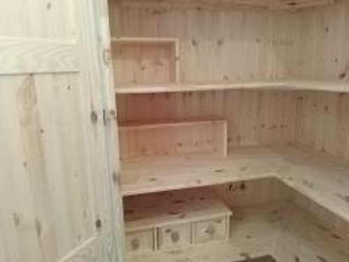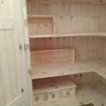 A HANDMADE FREESTANDING PANTRY/LARDER CUPBOARD MADE IN OUR WETHERBY WORKSHOP FROM SOLID PINE- A WALK-IN CORNER PANTRY WITH INTERNAL SHELVES/DRAWERS AND SECTIONS TO MAKE A MASSIVE STORAGE SECTION. COMES WITH TWO BASE UNITS WITH DRAWERS AND A FURTHER CUPBOARD UNDERNEATH. BOTH BASE UNITS HAVE THE 40MM OAK WORKTOP UPGRADE APPLIED.